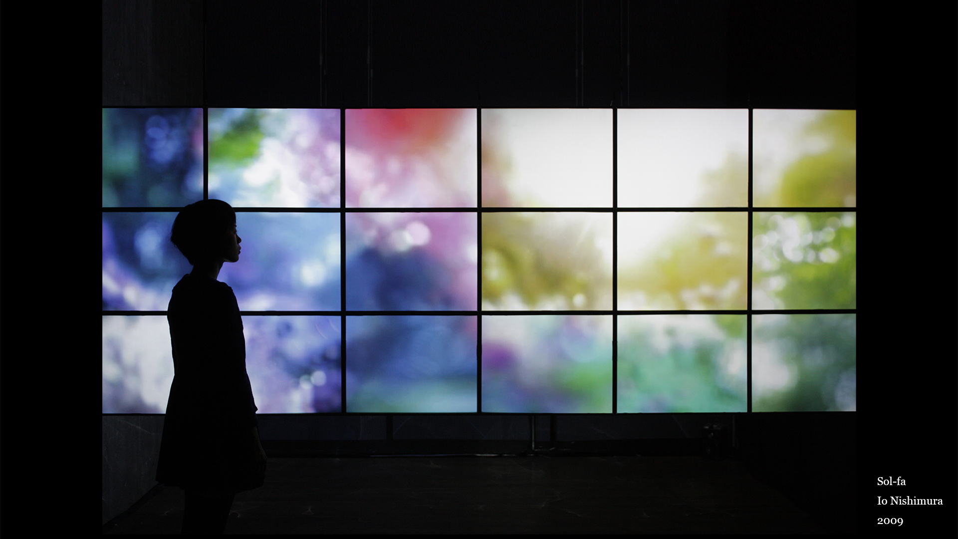 透過するプリントに映像を重ねて、緩やかに明滅させた。光と音の象徴として、ドレミファ音階と太陽光の虹色のグラデーションを結びつけ表現することを目指した写真インスタレーション。